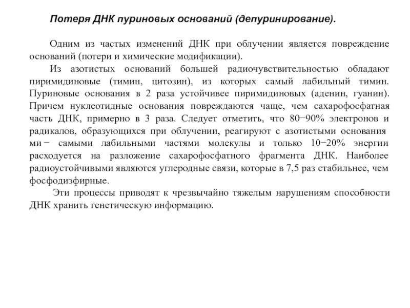 оснований большей радиочувствительностью обладают пиримидиновые (тимин, цитозин), из которых самый лабильный тимин. Пуриновые основания в 2 раза устойчивее пиримидиновых (аденин, гуанин). Причем нуклеотидные основания повреждаются чаще, чем сахарофосфатная часть ДНК, примерно в 3 раза. Следует отметить, что 8090% электронов и радикалов, образующихся при облучении, реагируют с азотистыми основаниями самыми лабильными частями молекулы и только 1020% энергии расходуется на разложение сахарофосфатного фрагмента ДНК. Наиболее радиоустойчивыми являются углеродные связи, которые в 7,5 раз стабильнее, чем фосфодиэфирные.