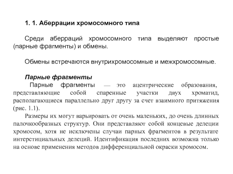 Парные фрагменты это ацентрические образования, представляющие собой спаренные участки двух хроматид, располагающиеся параллельно друг другу за счет взаимного притяжения (рис. 1.1).