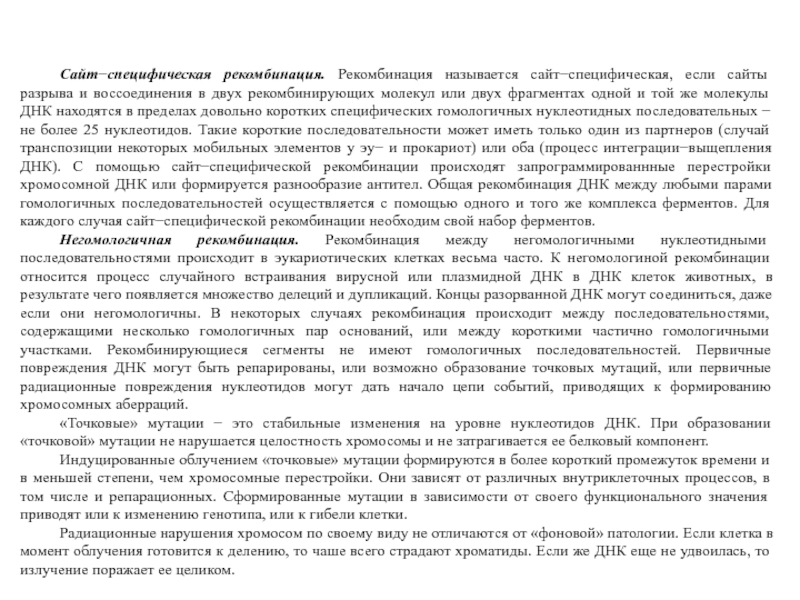 Негомологичная рекомбинация. Рекомбинация между негомологичными нуклеотидными последовательностями происходит в эукариотических клетках весьма часто. К негомологиной рекомбинации относится процесс случайного встраивания вирусной или плазмидной ДНК в ДНК клеток животных, в результате чего появляется множество делеций и дупликаций. Концы разорванной ДНК могут соединиться, даже если они негомологичны. В некоторых случаях рекомбинация происходит между последовательностями, содержащими несколько гомологичных пар оснований, или между короткими частично гомологичными участками. Рекомбинирующиеся сегменты не имеют гомологичных последовательностей. Первичные повреждения ДНК могут быть репарированы, или возможно образование точковых мутаций, или первичные радиационные повреждения нуклеотидов могут дать начало цепи событий, приводящих к формированию хромосомных аберраций.