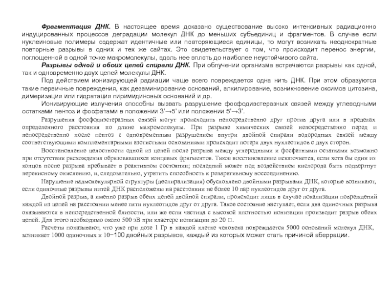 Слайд 31Фрагментация ДНК. В настоящее время доказано существование высоко интенсивных радиационно
