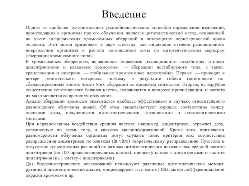 специфических хромосомных аберраций в лимфоцитах периферической крови человека. Этот метод применяют в двух аспектах: для индикации степени радиационного повреждения организма и расчета поглощенной дозы по цитогенетическим маркерам (аберрации хромосомного типа).