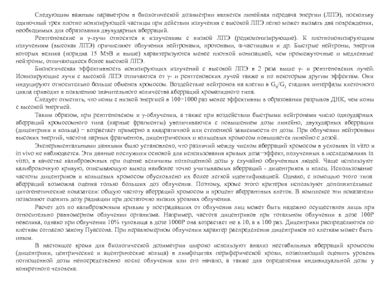 Слайд 39Следующим важным параметром в биологической дозиметрии является линейная передача энергии