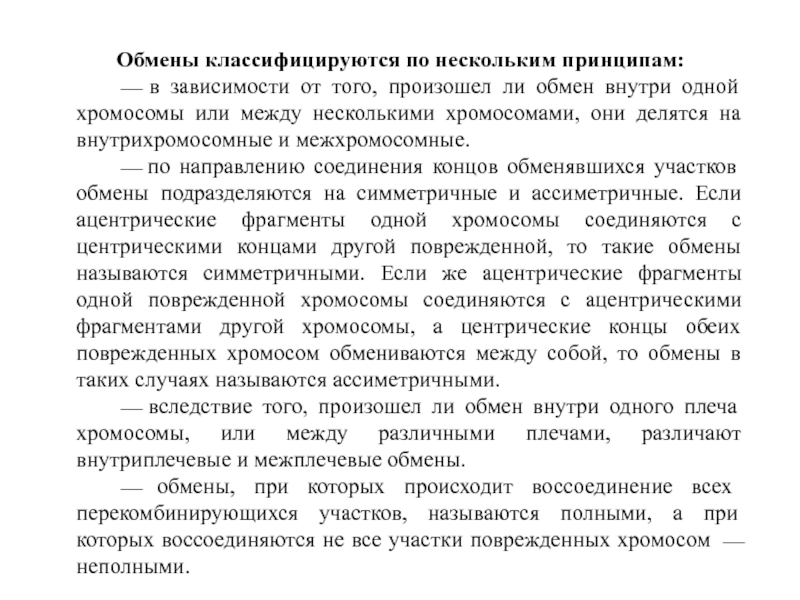 по направлению соединения концов обменявшихся участков обмены подразделяются на симметричные и ассиметричные. Если ацентрические фрагменты одной хромосомы соединяются с центрическими концами другой поврежденной, то такие обмены называются симметричными. Если же ацентрические фрагменты одной поврежденной хромосомы соединяются с ацентрическими фрагментами другой хромосомы, а центрические концы обеих поврежденных хромосом обмениваются между собой, то обмены в таких случаях называются ассиметричными.