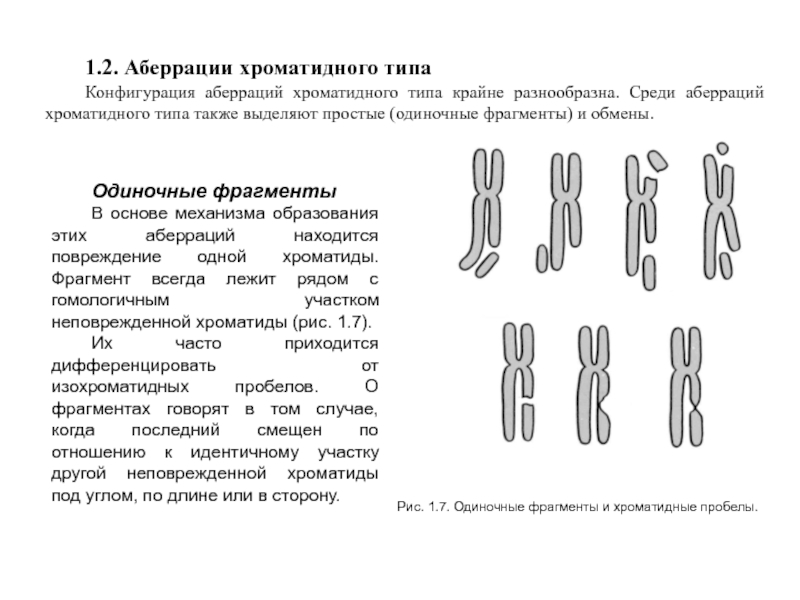 В основе механизма образования этих аберраций находится повреждение одной хроматиды. Фрагмент всегда лежит рядом с гомологичным участком неповрежденной хроматиды (рис. 1.7).