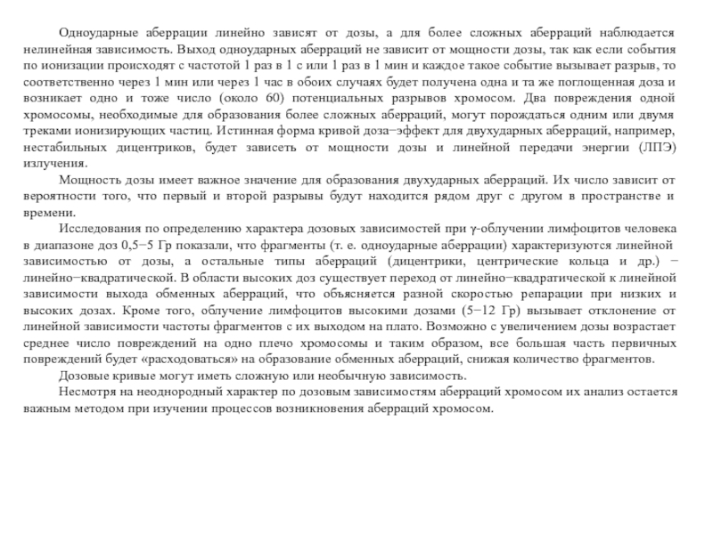 мощности дозы, так как если события по ионизации происходят с частотой 1 раз в 1 с или 1 раз в 1 мин и каждое такое событие вызывает разрыв, то соответственно через 1 мин или через 1 час в обоих случаях будет получена одна и та же поглощенная доза и возникает одно и тоже число (около 60) потенциальных разрывов хромосом. Два повреждения одной хромосомы, необходимые для образования более сложных аберраций, могут порождаться одним или двумя треками ионизирующих частиц. Истинная форма кривой дозаэффект для двухударных аберраций, например, нестабильных дицентриков, будет зависеть от мощности дозы и линейной передачи энергии (ЛПЭ) излучения.