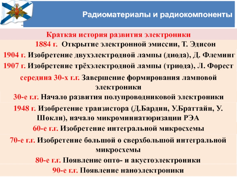 1948 г. Изобретение транзистора (Д.Бардин, У.Браттайн, У.Шокли), начало микроминиатюризации РЭА