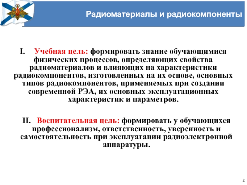 II. Воспитательная цель: формировать у обучающихся профессионализм, ответственность, уверенность и самостоятельность при эксплуатации радиоэлектронной аппаратуры.