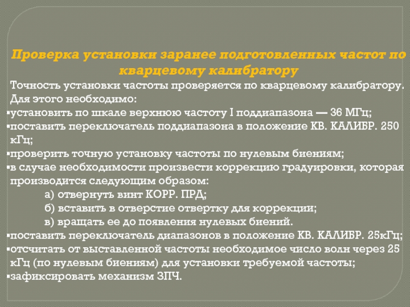 Слайд 12Проверка установки заранее подготовленных частот по кварцевому калибратору