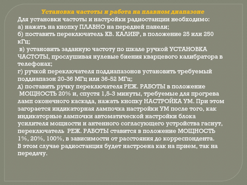 Слайд 10Установка частоты и работа на плавном диапазоне