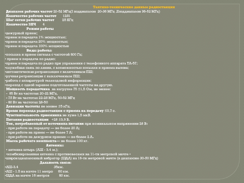 работы на передачу пониженной мощностью, что позволяет при работе на малые дальности связи более экономично использовать систему электропитания и уменьшить взаимные помехи;