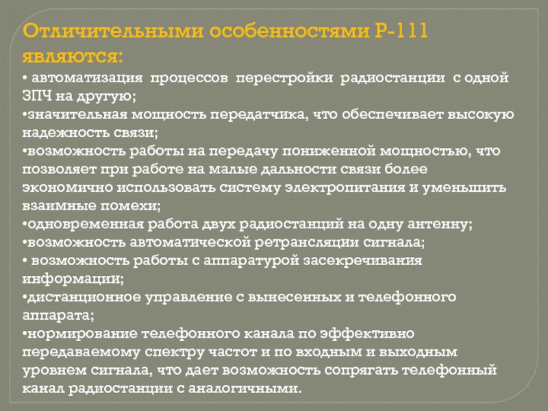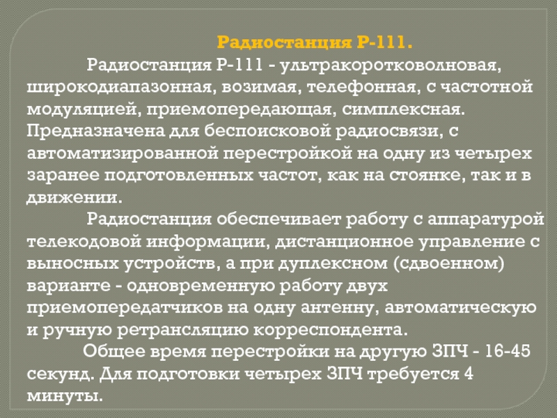 Радиостанция Р-111 - ультракоротковолновая, широкодиапазонная, возимая, телефонная, с частотной модуляцией, приемопередающая, симплексная.