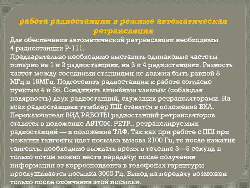 и 2 радиостанциях, на 3 и 4 радиостанциях. Разность частот между соседними станциями не должна быть равной 8 МГц и 16МГц. Подготовить радиостанции к работе согласно пунктам 4 и 5б. Соединить линейные клеммы (соблюдая полярность) двух радиостанций, служащих ретрансляторами. На всех радиостанциях тумблер ПШ ставятся в положение ВКЛ. Переключатели ВИД РАБОТЫ радиостанций ретрансляторов ставятся в положение АВТОМ. РЕТР., ретранслируемых радиостанций — в положение ТЛФ. Так как при работе с ПШ при нажатии тангенты идет посылка вызова 2100 Гц, то после нажатия тангенты необходимо выждать время в течение 3—5 секунд и только потом можно вести передачу; после получения информации от корреспондента в телефонах гарнитуры прослушивается посылка 3000 Гц. Выход на передачу возможен только после окончания этой посылки.