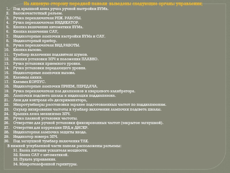Слайд 8На лицевую сторону передней панели выведены следующие органы управления;