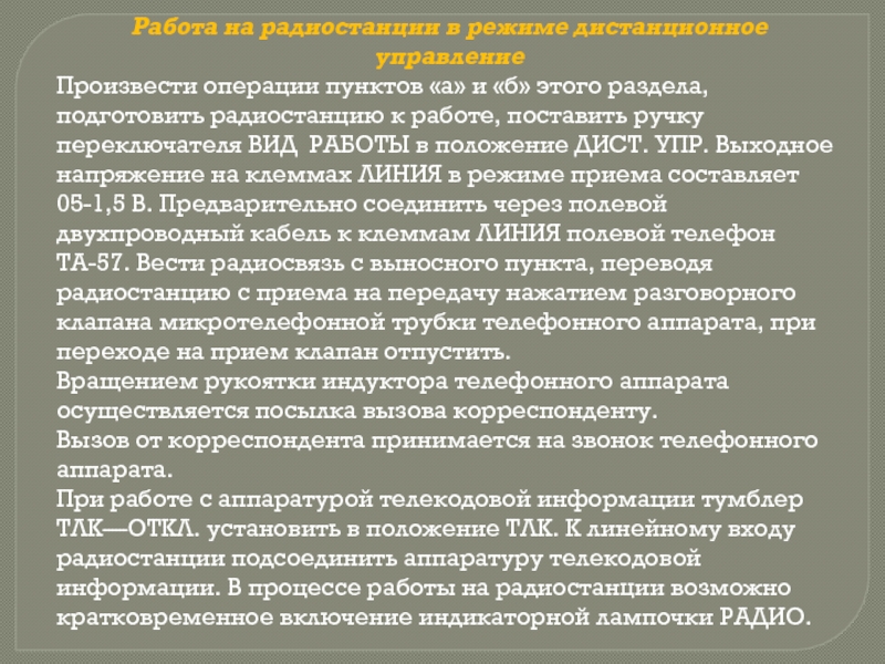 прием и передача по радио при управлении с телефонного аппарата ТА-57;