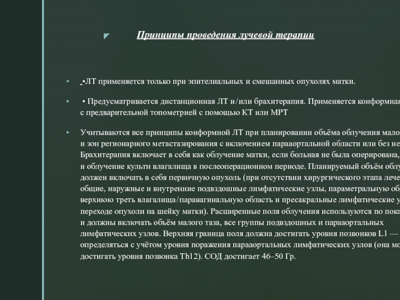 Учитываются все принципы конформной ЛТ при планировании объёма облучения малого таза и зон регионарного метастазирования с включением парааортальной области или без него. Брахитерапия включает в себя как облучение матки, если больная не была оперирована, так и облучение культи влагалища в послеоперационном периоде. Планируемый объём облучения должен включать в себя первичную опухоль (при отсутствии хирургического этапа лечения), общие, наружные и внутренние подвздошные лимфатические узлы, параметральную область, верхнюю треть влагалища / паравагинальную область и пресакральные лимфатические узлы (при переходе опухоли на шейку матки). Расширенные поля облучения используются по показаниям и должны включать объём малого таза, все группы подвздошных и парааортальных лимфатических узлов. Верхняя граница поля должна достигать уровня позвонков L1 — L2 или определяться с учётом уровня поражения парааортальных лимфатических узлов (она может достигать уровня позвонка Th12). СОД достигает 46–50 Гр.