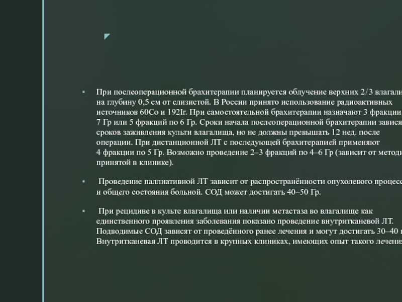 самостоятельной брахитерапии назначают 3 фракции по 7 Гр или 5 фракций по 6 Гр. Сроки начала послеоперационной брахитерапии зависят от сроков заживления культи влагалища, но не должны превышать 12 нед. после операции. При дистанционной ЛТ с последующей брахитерапией применяют 4 фракции по 5 Гр. Возможно проведение 2–3 фракций по 4–6 Гр (зависит от методики, принятой в клинике).