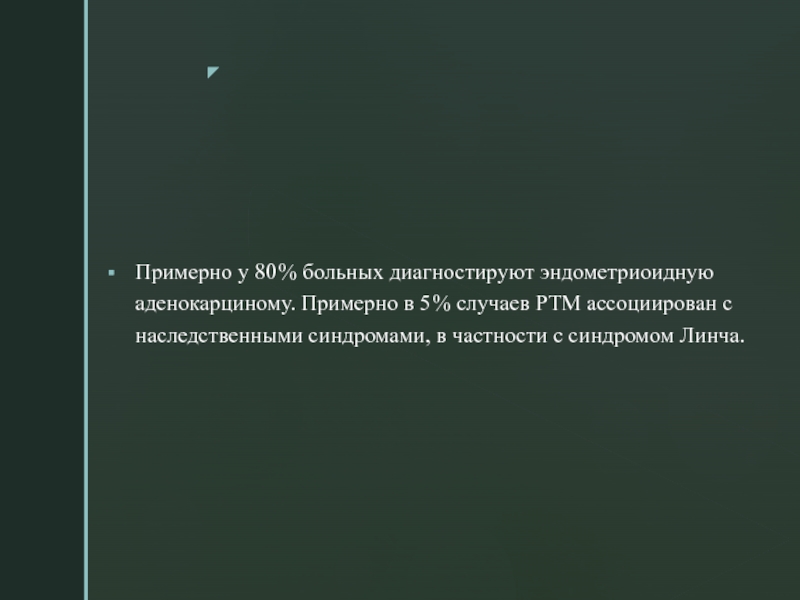 Слайд 7Примерно у 80 % больных диагностируют эндометриоидную аденокарциному. Примерно в 5 %