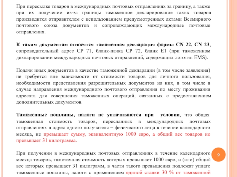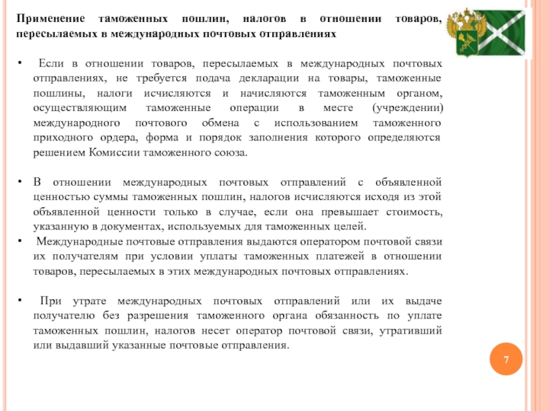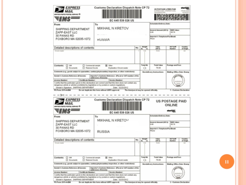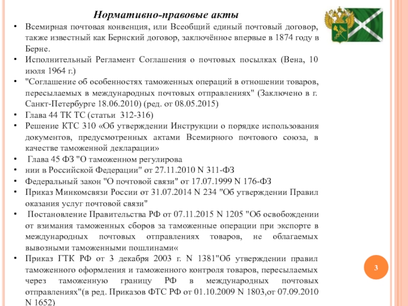 Приказ ГТК РФ от 3 декабря 2003 г. N 1381"Об утверждении правил таможенного оформления и таможенного контроля товаров, пересылаемых через таможенную границу РФ в международных почтовых отправлениях"(в ред. Приказов ФТС РФ от 01.10.2009 N 1803,от 07.09.2010 N 1652)