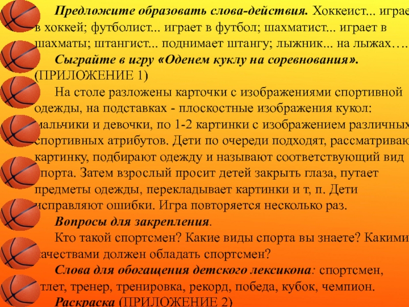 Предложите образовать слова-действия. Хоккеист... играет в хоккей; футболист... играет в футбол; шахматист... играет в шахматы; штангист... поднимает