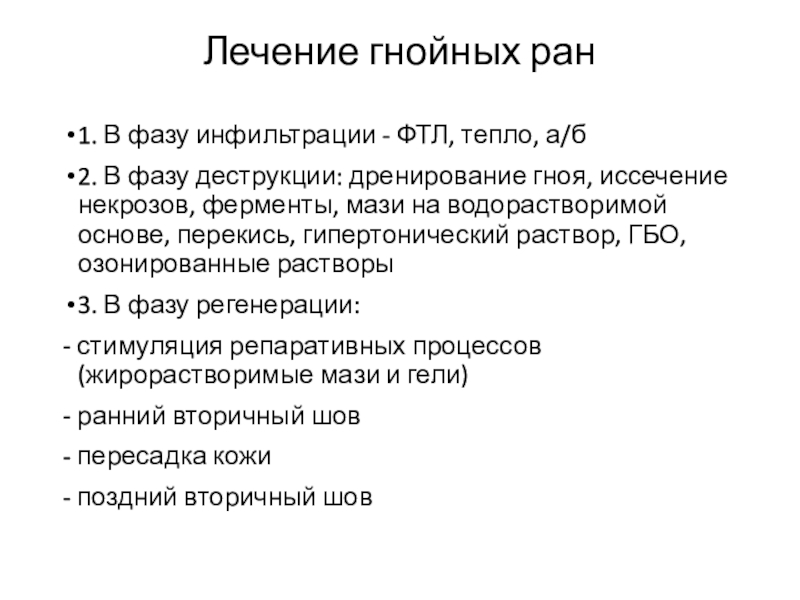 2. В фазу деструкции: дренирование гноя, иссечение некрозов, ферменты, мази