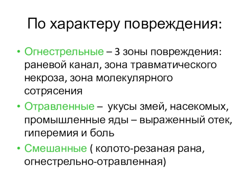 Огнестрельные – 3 зоны повреждения: раневой канал, зона