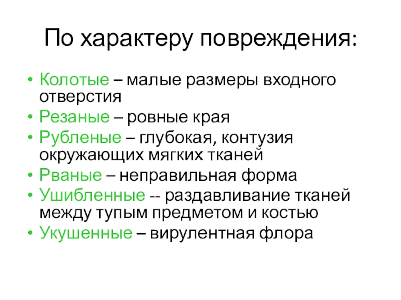 Чаще - колотые, резаные и рубленые раны, реже ушибленные и рваные, почти никогда- огнестрельные и укушенные