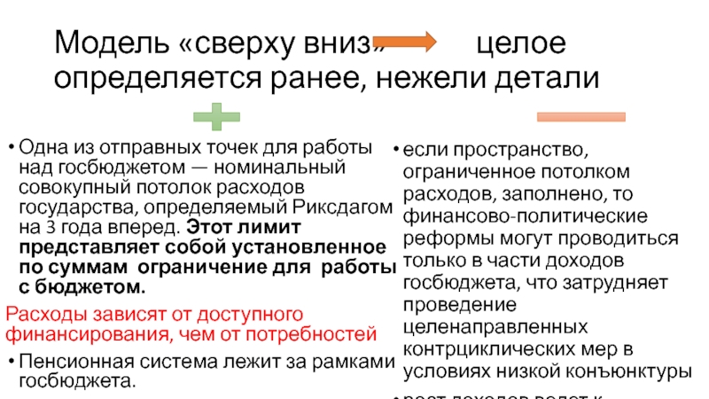 если пространство, ограниченное потолком расходов, заполнено, то финансово-политические реформы могут проводиться только в части доходов госбюджета, что затрудняет проведение целенаправленных контрциклических мер в условиях низкой конъюнктуры