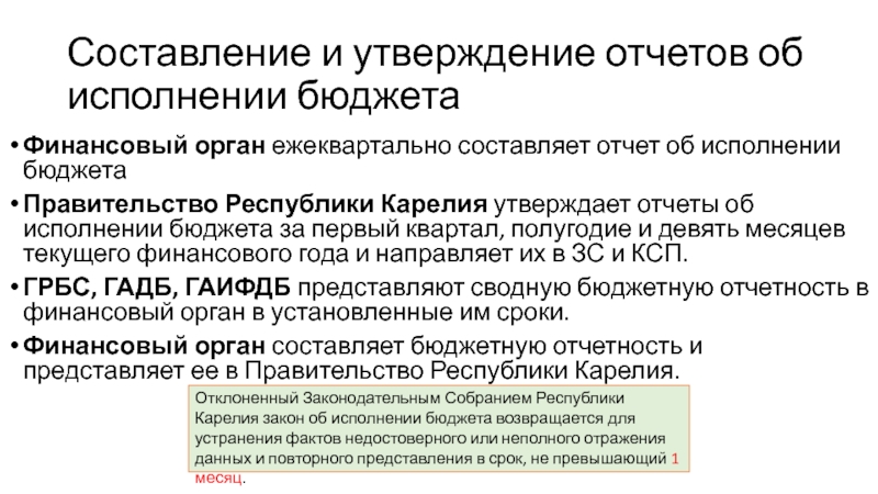 Отклоненный Законодательным Собранием Республики Карелия закон об исполнении бюджета возвращается для устранения фактов недостоверного или неполного отражения данных и повторного представления в срок, не превышающий 1 месяц.
