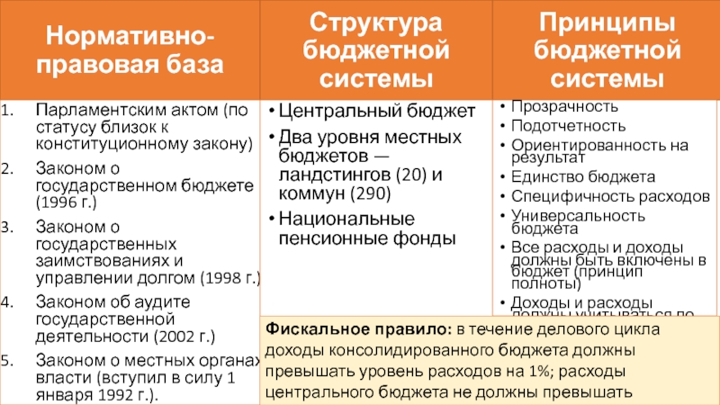 Фискальное правило: в течение делового цикла доходы консолидированного бюджета должны превышать уровень расходов на 1%; расходы центрального бюджета не должны превышать установленных лимитов