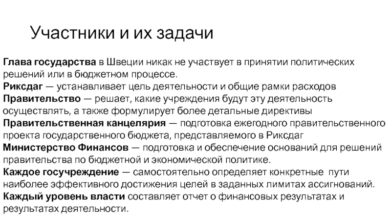 Отделение политики, которую проводят министерства (13), от операционных функций, которые осуществляют агентства (300), является основой государственного управления в Швеции более 200 лет.