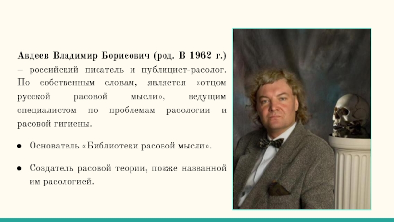 и публицист-расолог. По собственным словам, является «отцом русской расовой мысли»,