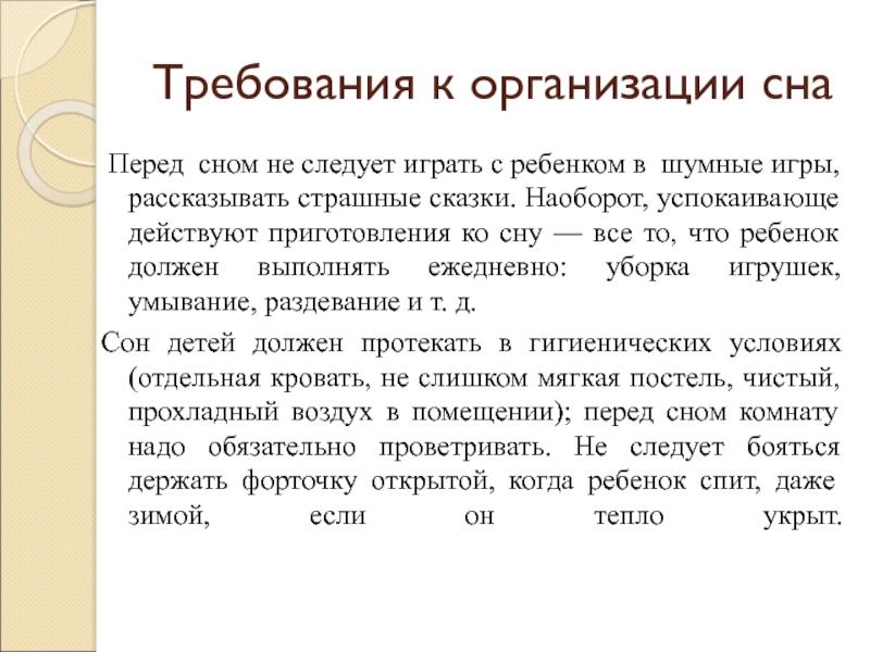 Сон детей должен протекать в гигиенических условиях (отдельная кровать, не слишком мягкая постель, чистый, прохладный воздух в помещении); перед сном комнату надо обязательно проветривать. Не следует бояться держать форточку открытой, когда ребенок спит, даже зимой, если он тепло укрыт.
