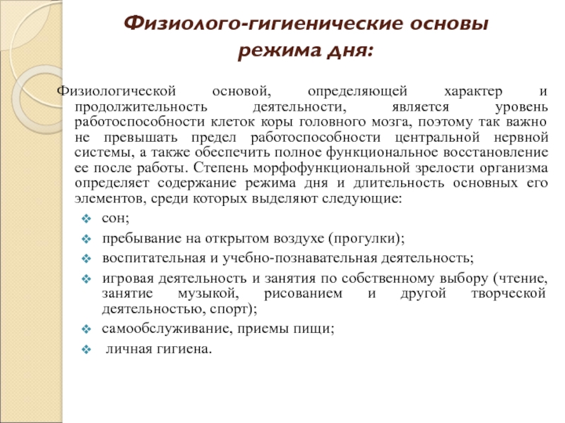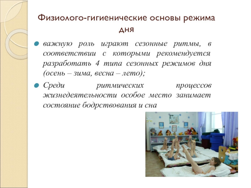 Слайд 3Физиолого-гигиенические основы режима дня: