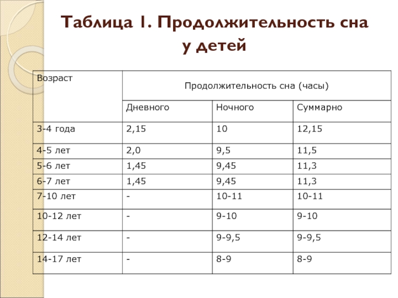 Слайд 8Таблица 1. Продолжительность сна у детей