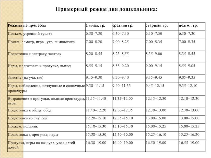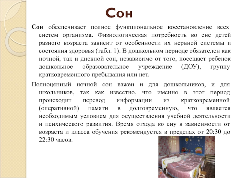 особенности их нервной системы и состояния здоровья (табл. 1). В дошкольном периоде обязателен как ночной, так и дневной сон, независимо от того, посещает ребенок дошкольное образовательное учреждение (ДОУ), группу кратковременного пребывания или нет.