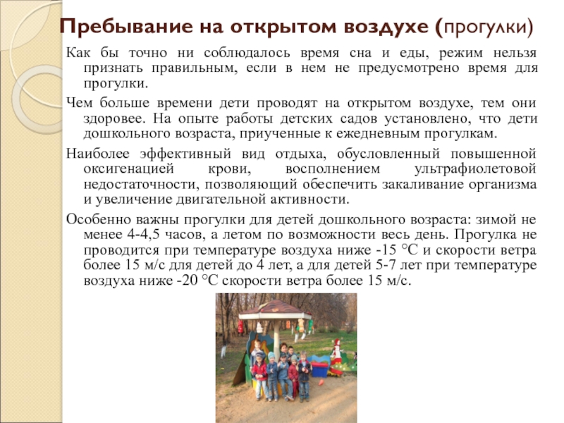 Особенно важны прогулки для детей дошкольного возраста: зимой не менее 4-4,5 часов, а летом по возможности весь день. Прогулка не проводится при температуре воздуха ниже -15 °С и скорости ветра более 15 м/с для детей до 4 лет, а для детей 5-7 лет при температуре воздуха ниже -20 °С скорости ветра более 15 м/с.