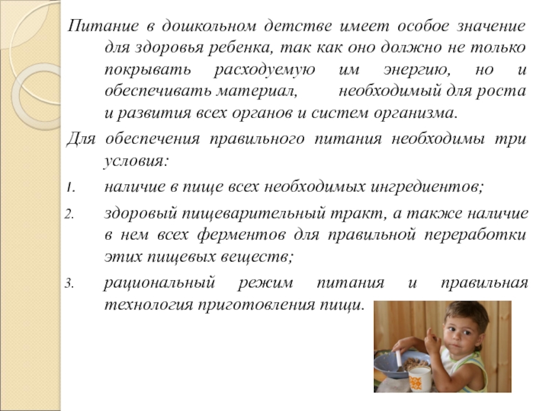 Слайд 10Питание в дошкольном детстве имеет особое значение для здоровья ребенка,