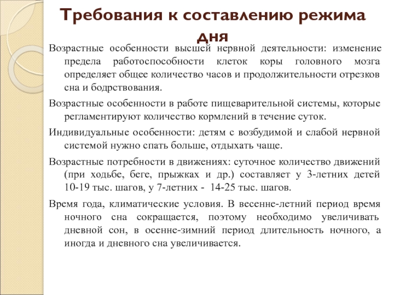 не превышать предел работоспособности центральной нервной системы, а также обеспечить полное функциональное восстановление ее после работы. Степень морфофункциональной зрелости организма определяет содержание режима дня и длительность основных его элементов, среди которых выделяют следующие:
