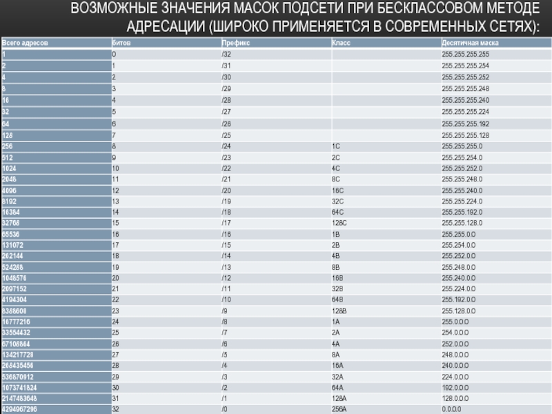 Слайд 11ВОЗМОЖНЫЕ ЗНАЧЕНИЯ МАСОК ПОДСЕТИ ПРИ БЕСКЛАССОВОМ МЕТОДЕ АДРЕСАЦИИ (ШИРОКО ПРИМЕНЯЕТСЯ
