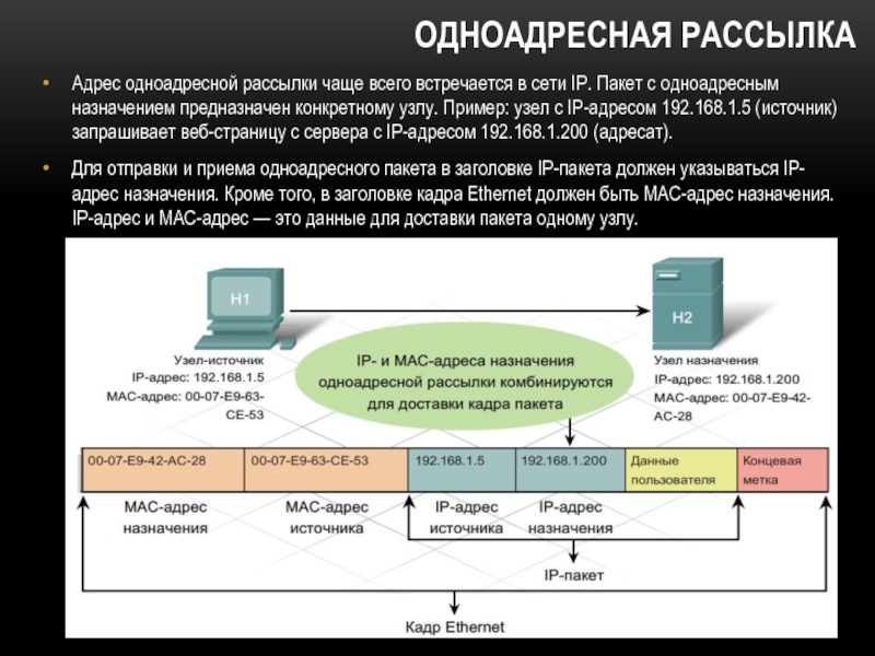 Для отправки и приема одноадресного пакета в заголовке IP-пакета должен указываться IP-адрес назначения. Кроме того, в заголовке кадра Ethernet должен быть MAC-адрес назначения. IP-адрес и MAC-адрес — это данные для доставки пакета одному узлу.