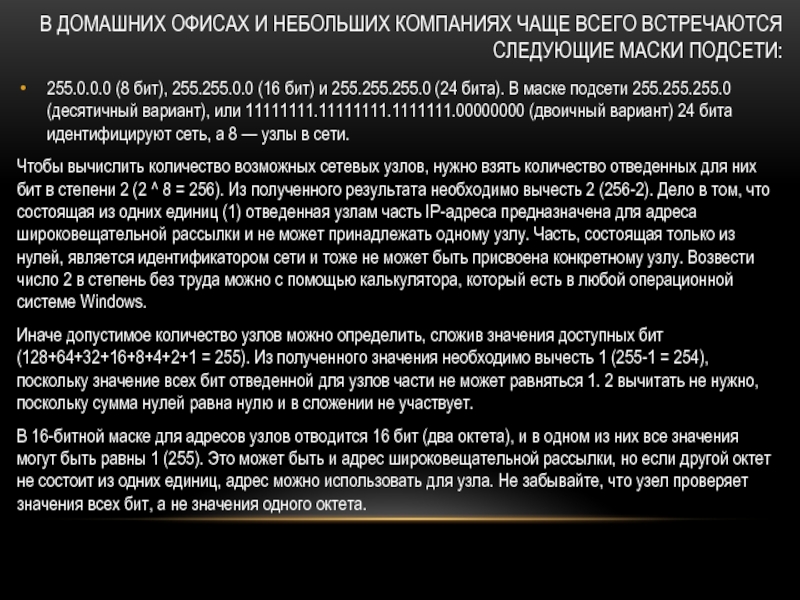 бита). В маске подсети 255.255.255.0 (десятичный вариант), или 11111111.11111111.1111111.00000000 (двоичный вариант) 24 бита идентифицируют сеть, а 8 — узлы в сети.