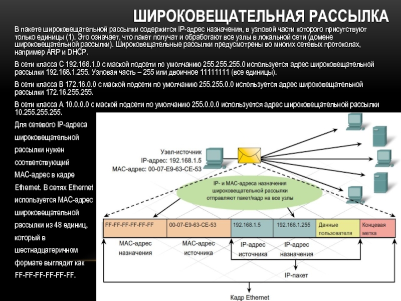 получат и обработают все узлы в локальной сети (домене широковещательной рассылки). Широковещательные рассылки предусмотрены во многих сетевых протоколах, например ARP и DHCP.