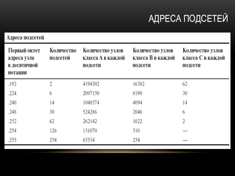 Слайд 8КЛАССЫ IP АДРЕСОВ И МАСКИ ПОДСЕТИ ПО УМОЛЧАНИЮ