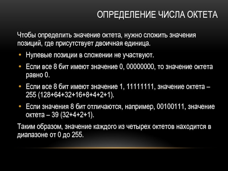 Если все 8 бит имеют значение 1, 11111111, значение октета – 255 (128+64+32+16+8+4+2+1).