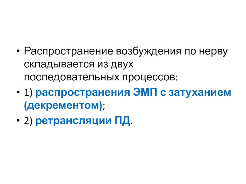 Распространение возбуждения по нерву складывается из двух последовательных процессов: 1) распространения ЭМП с затуханием (декрементом); 2) ретрансляции