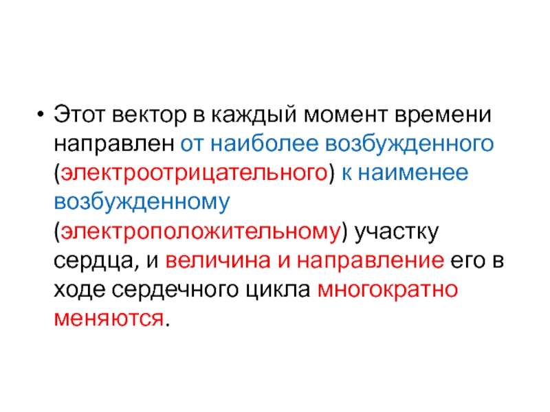 Этот вектор в каждый момент времени направлен от наиболее возбужденного (электроотрицательного) к наименее возбужденному (электроположительному) участку сердца,