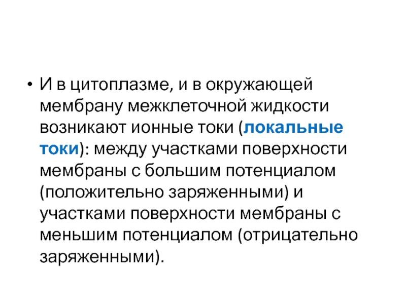 И в цитоплазме, и в окружающей мембрану межклеточной жидкости возникают ионные токи (локальные токи): между участками поверхности
