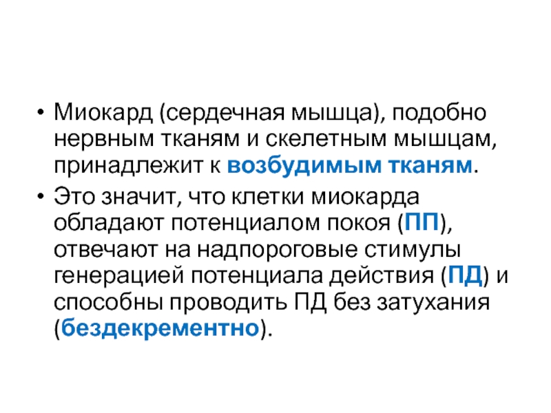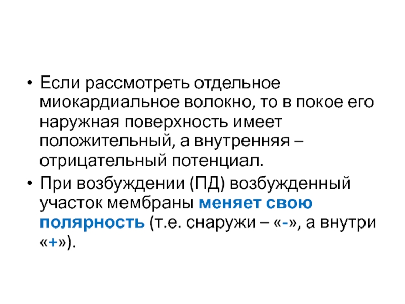 Если рассмотреть отдельное миокардиальное волокно, то в покое его наружная поверхность имеет положительный, а внутренняя – отрицательный