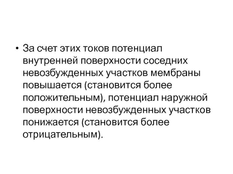 За счет этих токов потенциал внутренней поверхности соседних невозбужденных участков мембраны повышается (становится более положительным), потенциал наружной