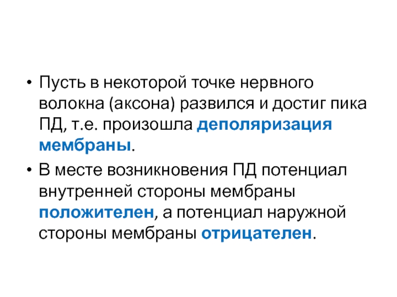 Пусть в некоторой точке нервного волокна (аксона) развился и достиг пика ПД, т.е. произошла деполяризация мембраны. В